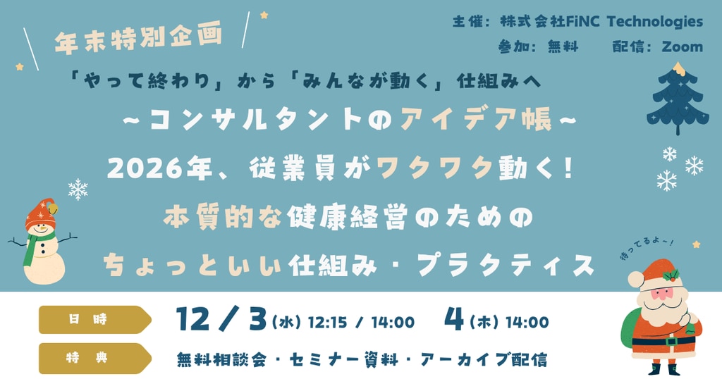 セミナーアーカイブ「やって終わり」から「みんなが動く」仕組みへ~コンサルタントのアイデア帳~ 2026年、従業員がワクワク動く!本質的な健康経営のためのちょっといい仕組み・プラクティスセミナーアーカイブ配信2025年11月12日