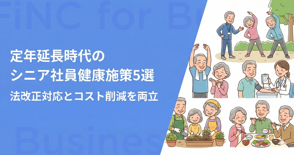 定年延長時代のシニア社員健康施策5選|法改正対応とコスト削減を両立健康経営・優良法人認定導入事例福利厚生・インセンティブ人事労務管理負担軽減・業務効率化DX・SaaS活用2025年12月18日FiNCコンサルティングチーム