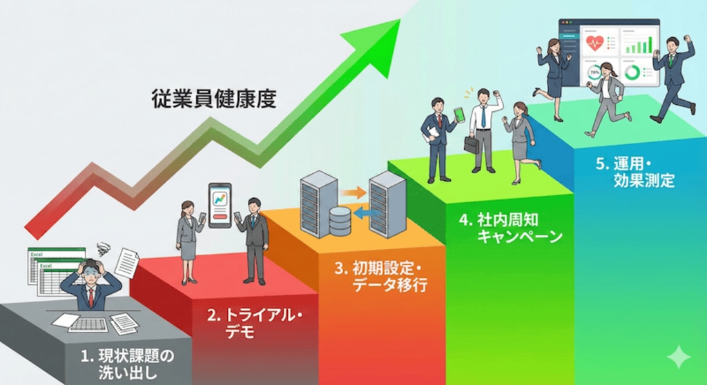 [画像挿入推奨: 導入から運用定着までの5ステップを階段状に描いたプロセス図。ステップが進むごとに従業員の健康度が上がっていくイメージ。]
