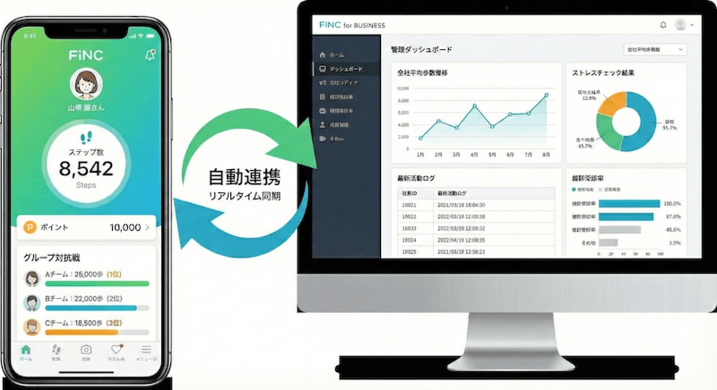 管理者へのメリット: アプリから吸い上がったデータ(歩数、健診結果、ストレスチェックなど)が自動でシステムに連携。Excel管理から解放されます。