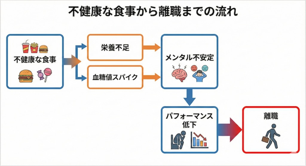 メンタル不調は、現代の企業における離職原因の上位を占めます。つまり、従業員の「ランチの中身」への介入は、組織の定着率を守るための重要なリスクマネジメントなのです。