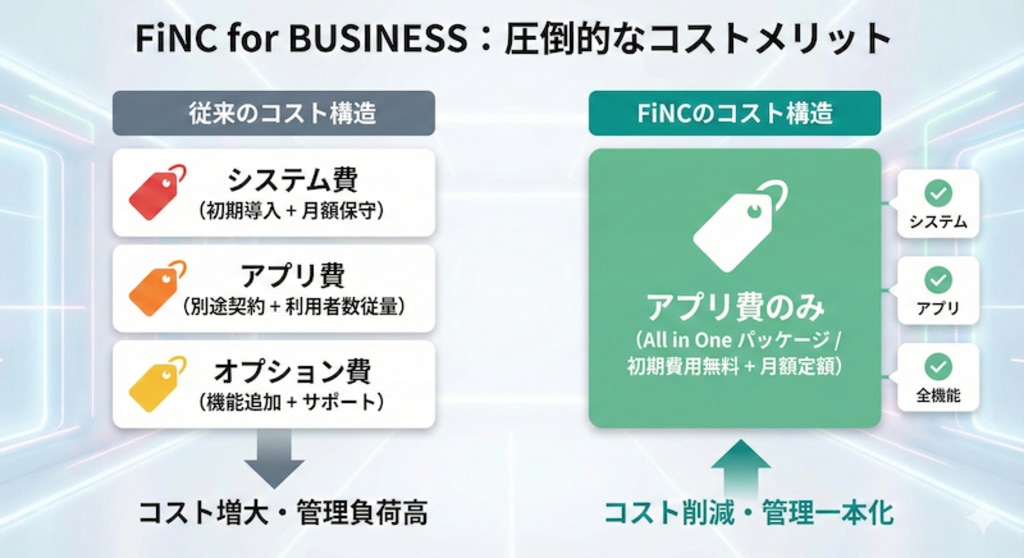 [画像挿入: 従来のコスト構造(システム費+アプリ費+オプション費)と、FiNCのコスト構造(アプリ費のみでAll in One)を比較する図]